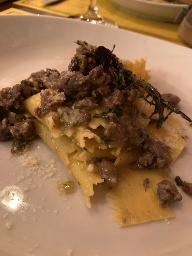 Siguiente plato: las pasta, obviamente, que al pedir para compartir nos la trajeron ya separada en dos porciones. Farfadelle con Carne de Jabalí. Es el año del Jabalí en el Horóscopo Chino, así que…